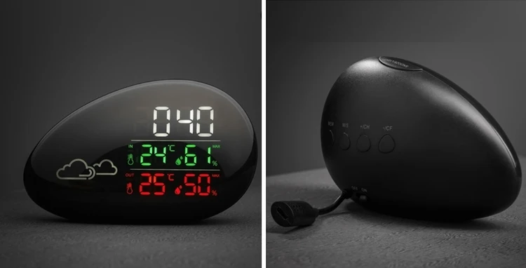 Миниатюрная домашняя метеостанция с высококонтрастным цветовым дисплеем. В функционал устройства входят измерение температуры и влажности на улице и в помещении, отображение часов и настройка будильника, фиксации максимальной/минимальной температуры и влажности.