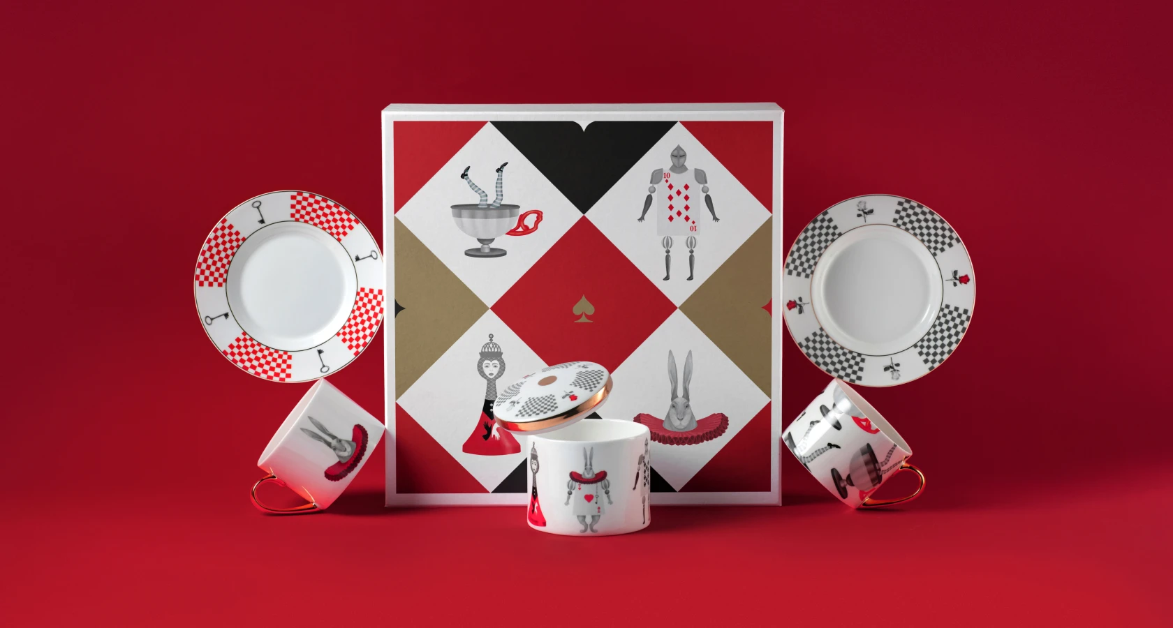 Причудливо разместившись в виде авторских иллюстраций на фарфоровых чайных парах, персонажи — Белый Кролик, задумчивая Гусеница, Червонная Королева с карточными рыцарями — словно приглашают на безумное чаепитие всех, кто устал от предсказуемости и повседневности.