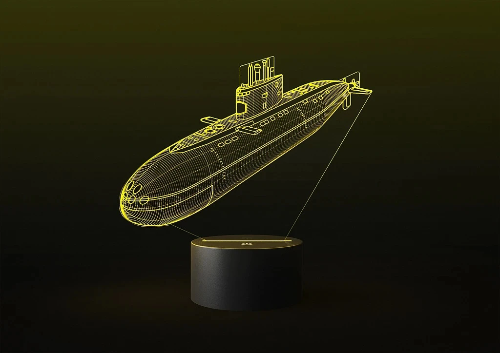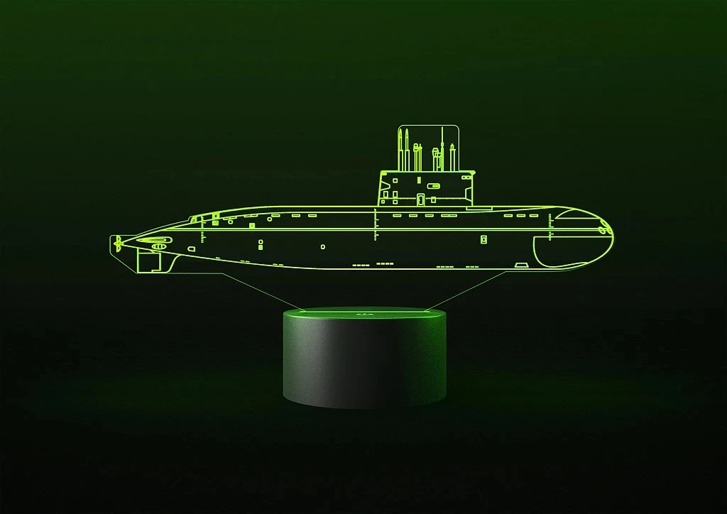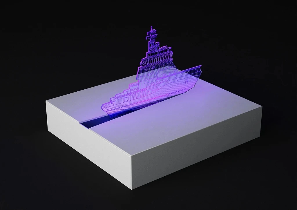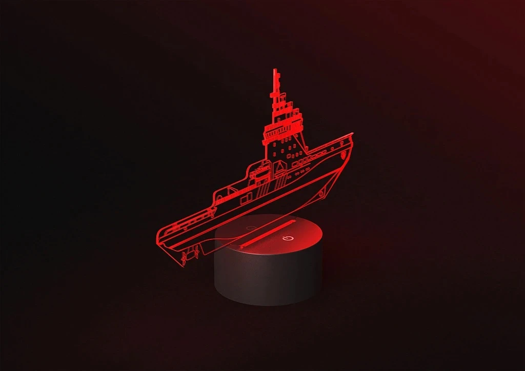 Второй вариант решения — упаковка для метеостанции. В данном случае она выполнена в форме носовой части корабля. Сама метеостанция тоже светится всеми LED-огнями, дополняя общую картину подарка.
