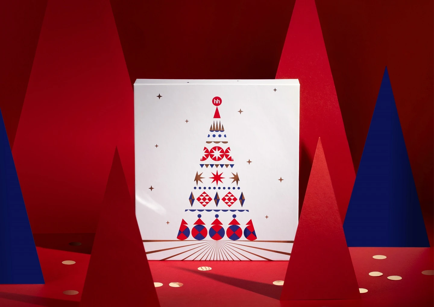 Основа набора — фарфоровые игрушки-«конфеты» (по 2–3 в каждом наборе). Они украшены изображениями сказочных животных и красочным новогодним паттерном, сочетающим золотой цвет с фирменными цветами HeadHunter — синим и красным.