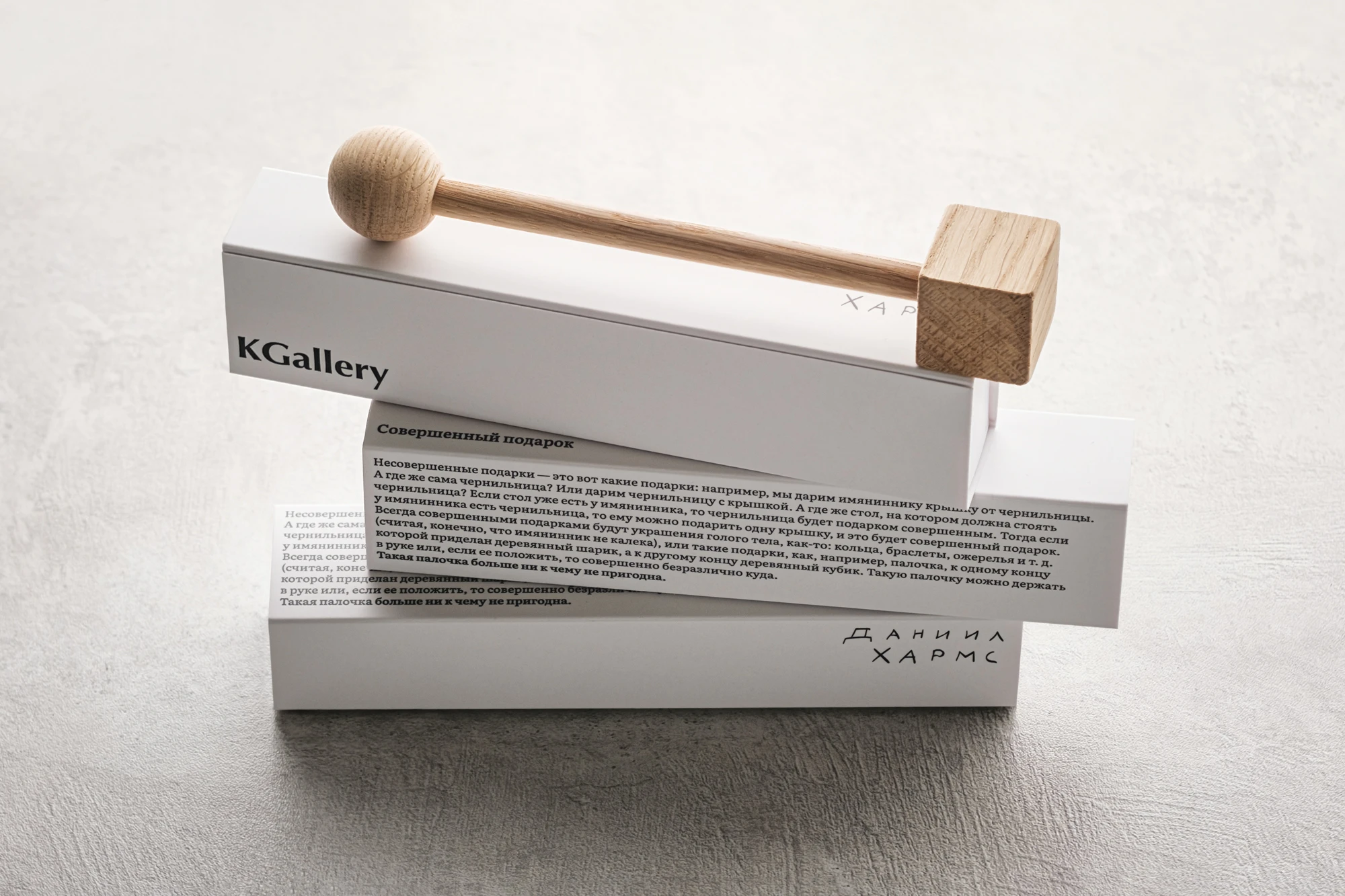 KGallery и Illan Gifts объединились, чтобы воплотить в жизнь одну из неординарных идей Даниила Хармса. Речь идет о деревянной палочке с шариком на одном конце и кубиком на другом — предмете, который литературный гений описал в собственной книге «О явлениях и существованиях».