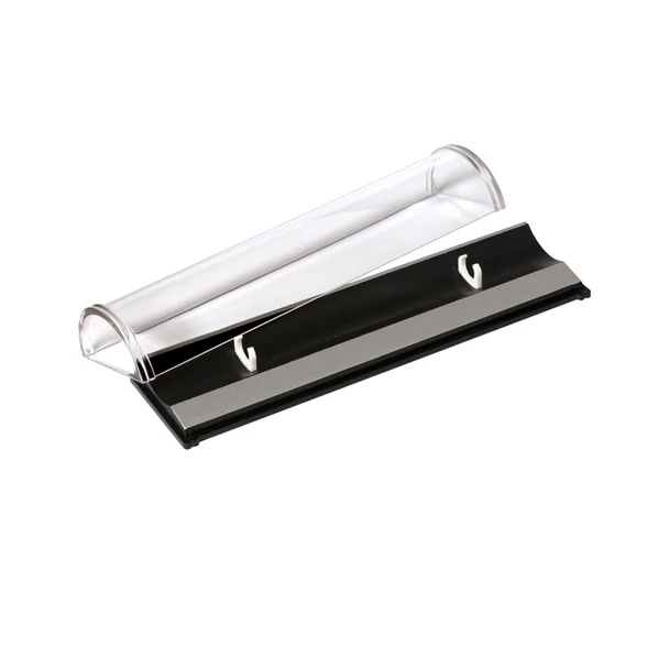 Поверхность гладкая, матовая, с приглушенным блеском. Цвет – классический черный. Отделка – серебристые матовые элементы вдоль корпуса. Два держателя для ручки белого цвета. Крышка прозрачная пластиковая. Футляр надежно закрывается и идеально подходит как для подарочного оформления изделия, так и для повседневного хранения бизнес-аксессуара.