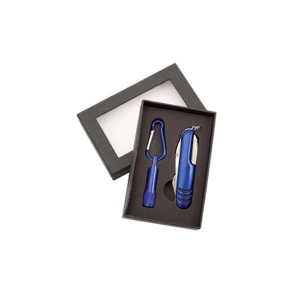 Комплект уложен в стильную коробку. Предметы выполнены в синем цвете, из прочного металла, фонарик укомплектован батарейкой. И фонарик, и нож оборудованы карабинами для удобного крепления.