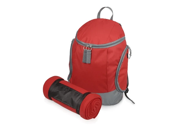 Рюкзак очень удобный и вместительный, позволяет взять с собой все необходимое для путешествия на природу: еду, запасную одежду, снаряжение для рыбалки или спортивный инвентарь. Плед сворачивается в удобный рулон с ручками для переноски. Оба предмета выполнены в едином красном цвете, могут быть персонализированы путем нанесения логотипа.