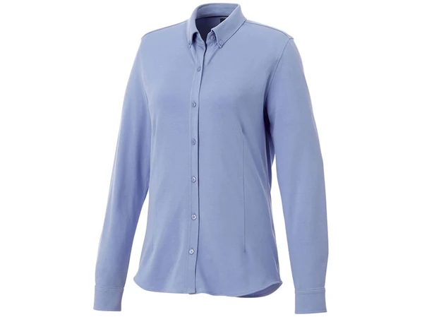 Правильно подобранная одежда очень важна для того, чтобы с первого взгляда производить благоприятное впечатление. Женская модель рубашки Bigelow от бренда Elevate пошита из голубого хлопка с добавлением эластана, что делает ткань не только приятной на ощупь, но и практичной, гладкой и немнущейся. Рубашку отличают:
