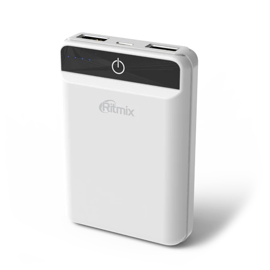 Внешний аккумулятор белого цвета RITMIX RPB-10003L на 10000 мАч. Поставляется вместе с micro usb кабелем.