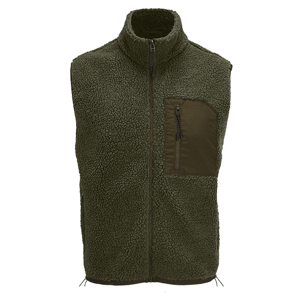 Темно-зеленый жилет унисекс из искусственного меха шерпа с карманами на молнии: 1 нагрудным из таслана для нанесения логотипа и 2 боковыми. Черные пуллеры на молниях со светоотражающими элементами.