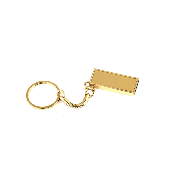 Золотистая прямоугольная флешка-брелок Слайд мини. Объем встроенного флеш-накопителя составляет 32 Гб. Вес изделия составляет 11 грамм. Аксессуар оснащен фиксатором-кольцом, что позволяет прочно закрепить изделие на ключах, рюкзаке или сумке.