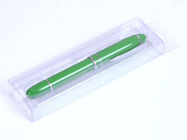Зеленый флеш-накопитель в виде металлической ручки с мини чипом, объем памяти 16 Гб. Металлический корпус.