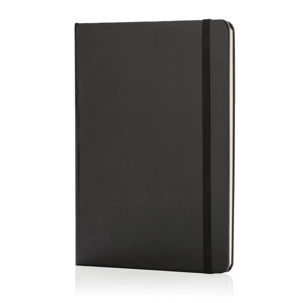 Черный выдержанный блокнот для записей Basic в твердой обложке формата А5 на резинке. Изделие дополнено текстильным ляссе. Листовой блок сформирован из 72 страниц линованной бумаги кремового цвета(70 г/м2).