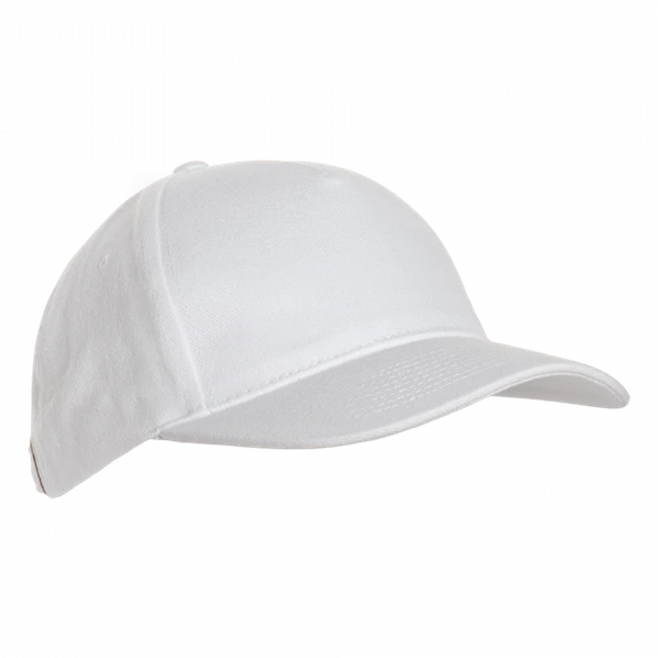 Классическая белая бейсболка-пятиклинка без лобового шва с изогнутым жестким козырьком. Посадка регулируется ремешком на металлической застежке.