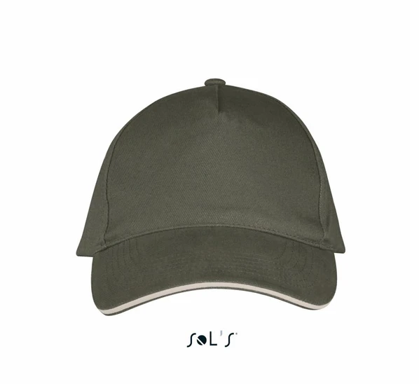 Классическая зелено-бежевая бейсболка Long Beach производства бренда Sol's. Жесткий козырек. 4 вышитых отверстия для вентиляции. Регулируемая металлическая застежка. 5 клиньев.