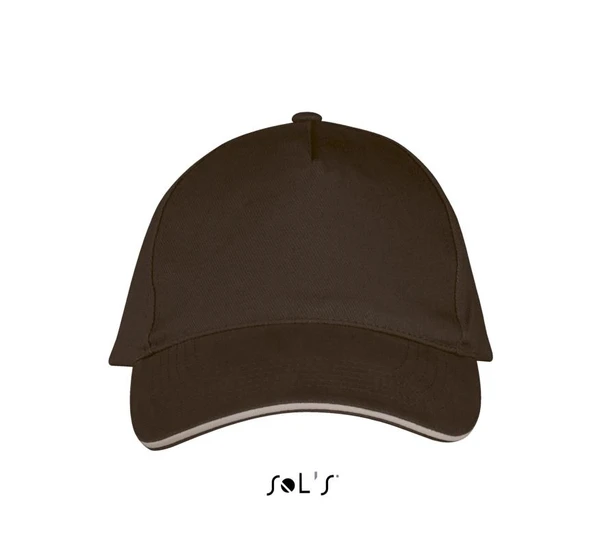 Классическая коричнево-бежевая бейсболка Long Beach производства бренда Sol's. Жесткий козырек. 4 вышитых отверстия для вентиляции. Регулируемая металлическая застежка. 5 клиньев.
