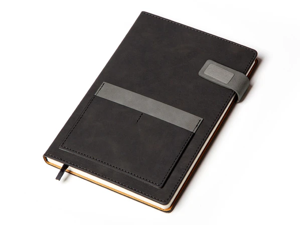 Практичный черно-серый бизнес-блокнот Freya в твердой обложке позволит вам не только навести порядок в вашем расписании и делах, но и не даст потерять важные визитки — для них прямо на обложке предусмотрен отдельный карман. Карман имеет три отделения: два под размер визиток или банковских карт и одно большего размера.