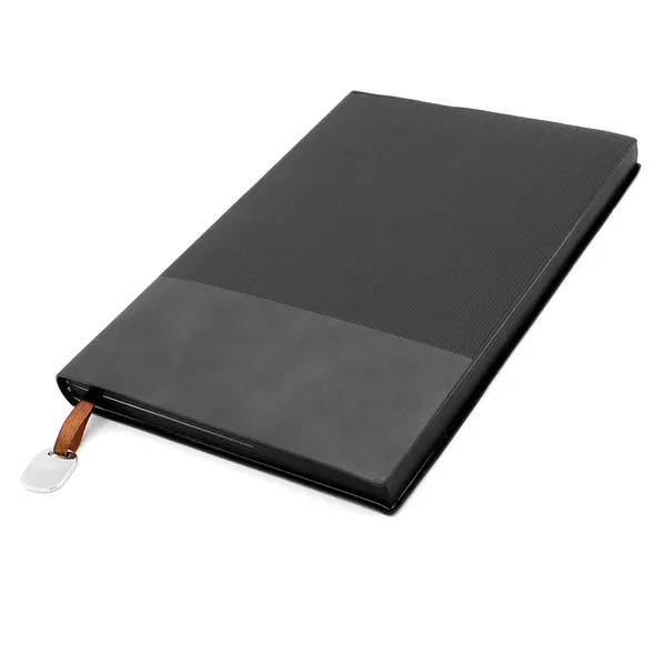 Размеры: 210*145 мм, 240 страниц / 120 листов, страницы разлинеенные, бумага плотностью 80 г/м2. Срез страниц прокрашен в цвет обложки блокнота. В аксессуарах представлены: ляссе c металлической биркой. На бирку можно заказать нанесение логотипа вашей компании.