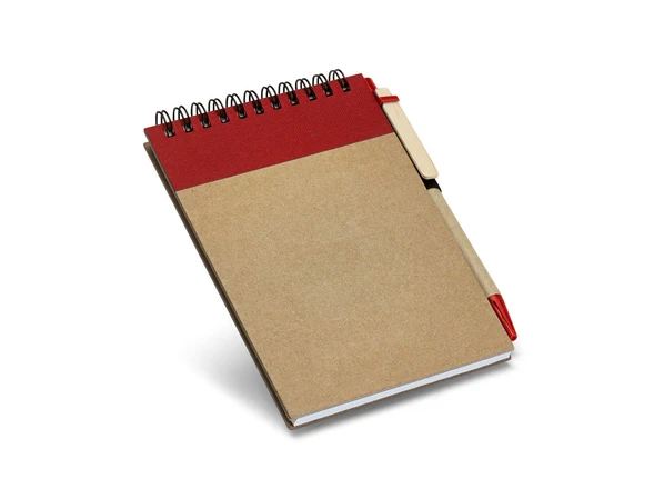 Карманный бежево-красный блокнот на спирали. Модель на 120 страниц из переработанной бумаги и обложкой из твердого картона. Блокнот имеет держатель для шариковой ручки (входит в комплект).