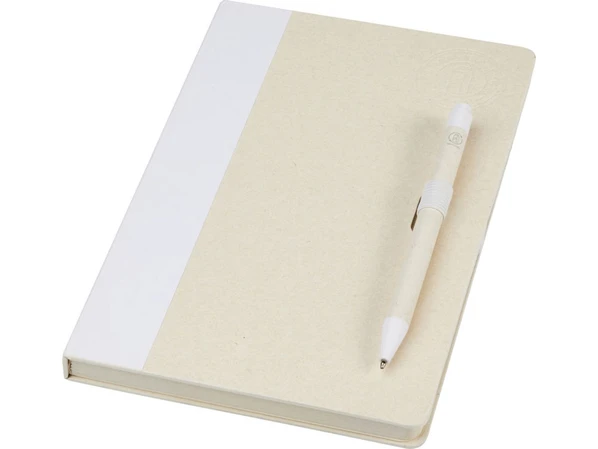 Бежево-белый блокнот A5 Dairy Dream с шариковой ручкой. Блокнот имеет 80 линованных листов (80 г/м²) из переработанных коробок из-под молока (до 70%), цветную спираль для бумаги и петлю для ручки. В петле находится шариковая ручка с кнопочным механизмом, цвет которой соответствует цвету блокнота.