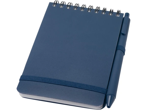 Блокнот имеет закругленные углы, эластичную застежку и петлю для ручки. Шариковая ручка с черными чернилами также изготовлена из переработанного океанического пластика.