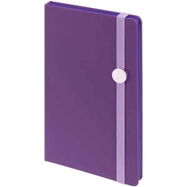 Блокнот в твердой обложке, выполнен из материала Soft Touch, фиолетовый, дополнен резинкой и ляссе в цвет обложки.