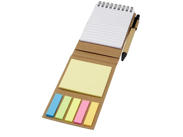 Липкий блокнот с шариковой ручкой. В блокноте 30 листов белой линованной бумаги плотностью 70 г/м2 (8 x 12 см). В комплект также входят 25 разноцветных (5 x 1,2 см) и 25 желтых (7,5 x 7,5 см) клейких листочков, оба типа на бумаге плотностью 70 г/м2.
