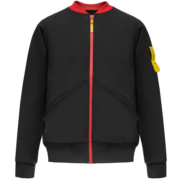 Бомбер с потайными карманами, контрастным воротником и декоративными элементами. Модель унисекс средней длины.