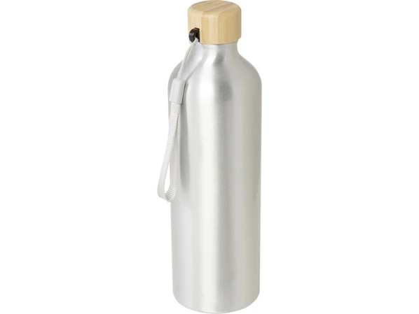Классическая серебристая бутылка для воды Malpeza из переработанного алюминия, сертифицированного по стандарту RCS, со стильной бамбуковой крышкой.