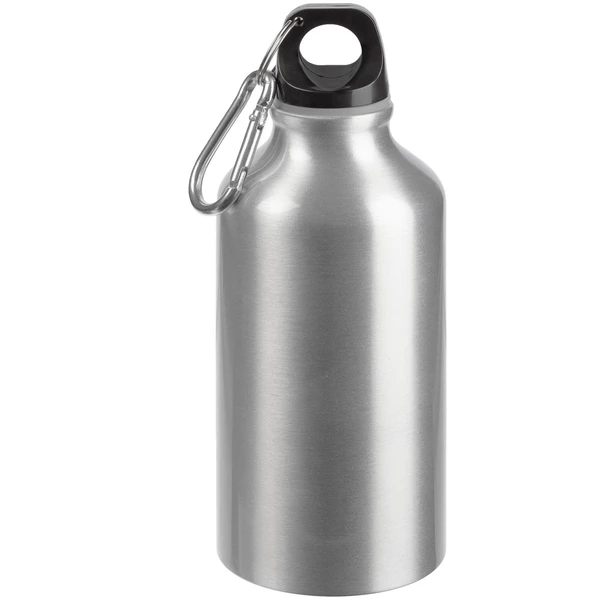 Металлическая серебристая бутылка Tiron. Алюминиевая глянцевая бутылка. Крышка — пластик с карабином в цвет бутылки.