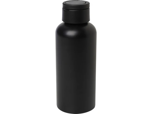Стильная черная бутылка для воды из переработанного алюминия, сертифицированного согласно RCS, с элегантным дизайном. Имеет крышку из переработанного пластика с отдельной петлей для переноски.