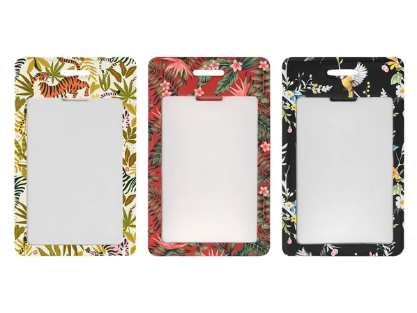 Прорезь для ланъярда или ретрактора расположена таким образом, что карман имеет вертикальную ориентацию. Изображение наносится в "край" на искусственную кожу в соответствии с макетом.