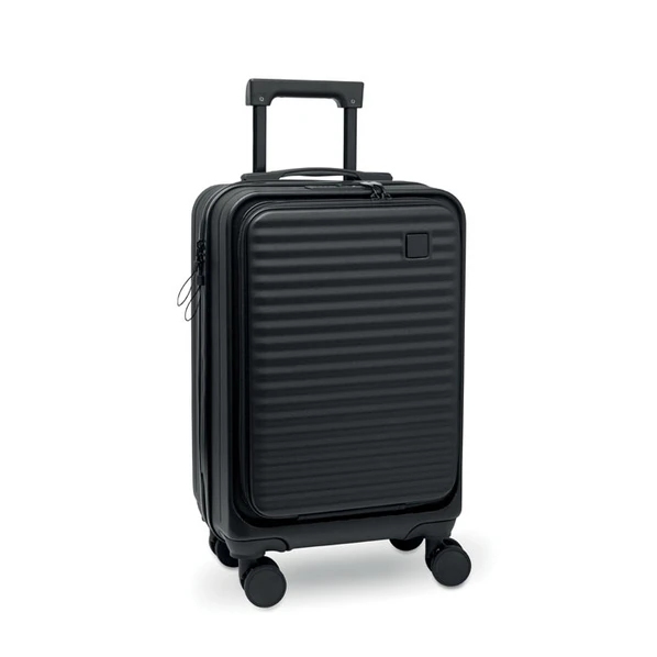Надежный черный 20-дюймовый пластиковый чемодан на колесиках. 1 основное отделение с внутренним карманом. Дополнительное переднее отделение на молнии для документов и отделение с мягкой подкладкой для 15-дюймового ноутбука.