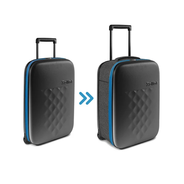Складной легкий черно-синий чемодан Rollink Earth черного цвета с оранжевой молнией. Размер 55х40х20 см. В сложенном виде толщина составляет 5 см, с колёсами 8,5 см.