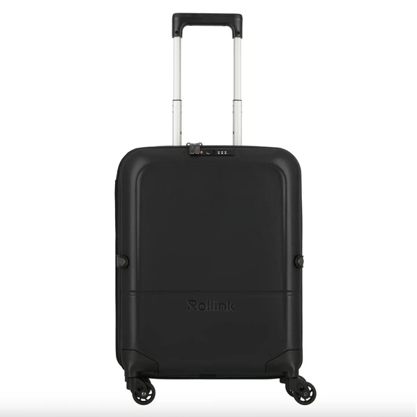 Складной черный легкий чемодан Rollink Flex Light на четырех колесах. Размер 55х40х20 см. В сложенном виде толщина составляет 11,55 см. Объем 40 л. Вес 2,45 кг.