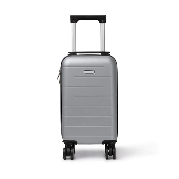 Жесткий серый чемодан Vigo на колесиках сделан из прочного АБС-пластика. Внутри два основных отделения. В комплект входят съемные поворотные на 360 градусов колеса и дорожный чехол.