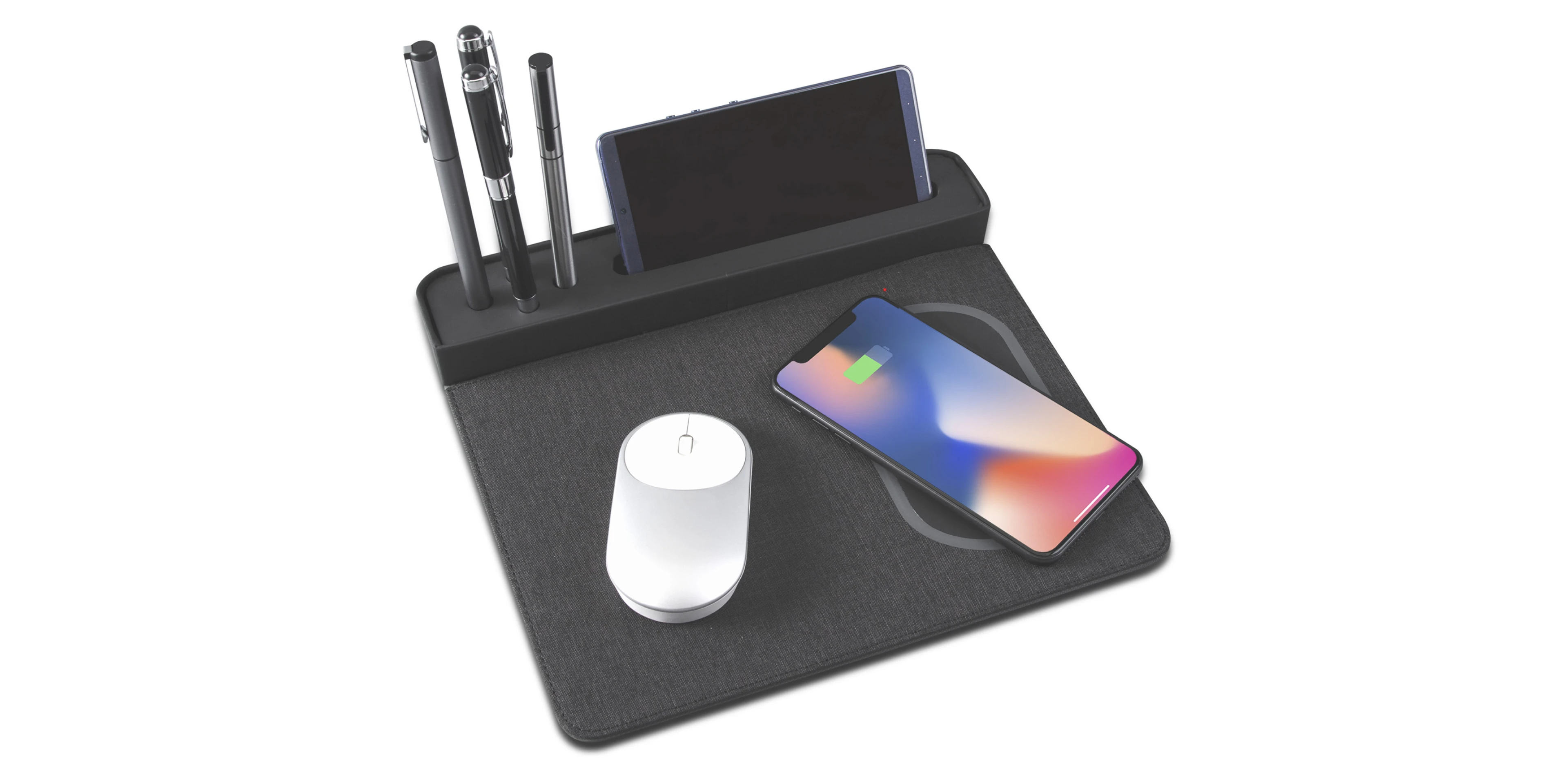Настольный многофункциональный органайзер черного цвета с беспроводным ЗУ.