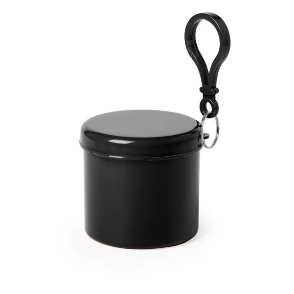 Универсальный дождевик белого цвета Birtox в черном футляре для хранения и переноски. Футляр оснащен карабином для фиксации на рюкзаке или сумке.