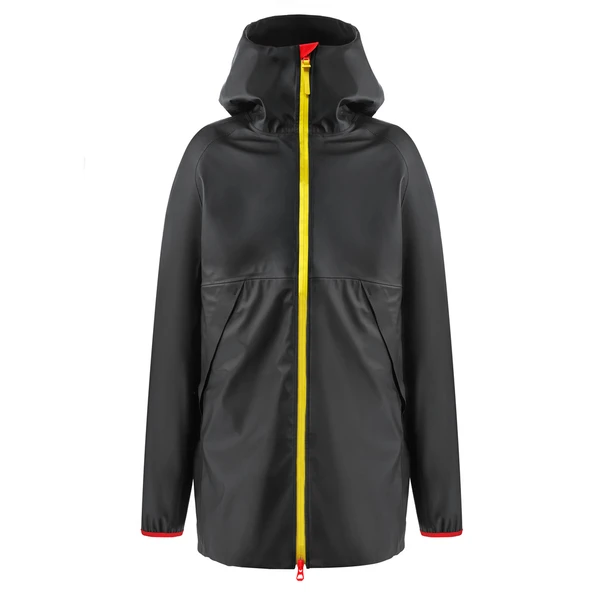 Дождевик из влагоотталкивающего материала с молнией контрастного цвета. Модель унисекс прямого силуэта и средней длины.