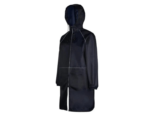 Темно-синий плащ-дождевик Sunshine прямого силуэта с капюшоном и рукавом реглан. Застегивается на центральную молнию со светоотражающей полосой с внутренней ветрозащитной планкой. Накладные карманами с клапанами.