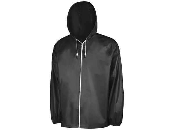 Короткий черный дождевик унисекс из полиэстера с водоотталкивающей пропиткой на молнии. Дополнительная проклейка швов обеспечивает большую степень водонепроницаемости. Рукав реглан обеспечивает комфортную посадку, не сковывает движения, что позволяет использовать дождевик для активного отдыха, а резинка по низу помогает сохранить тепло, препятствуя попаданию влаги и защищая от ветра.