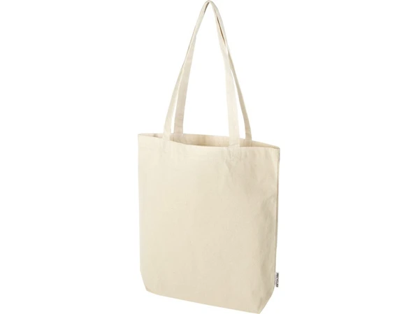 Практичная бежевая эко-сумка Florida с широким дном, изготовленная из 100% переработанного хлопка, сертифицированного согласно GRS, плотностью 270 г/м², станет более ответственным и долговечным выбором для ваших повседневных нужд.