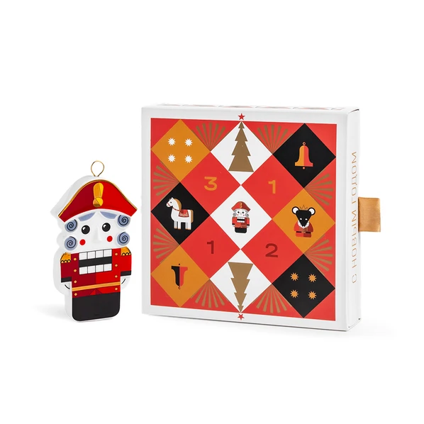 Елочная игрушка «Щелкунчик» из одноименной коллекции в подарочном пенале с матовой ламинацией. Декорирование золотом. Крепление: атласная лента.