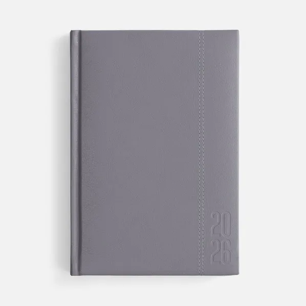 Серый ежедневник с твердой обложкой с поролоном из искусственной кожи, дополнен декоративной строчкой, капталом и ляссе в цвет ежедневника.