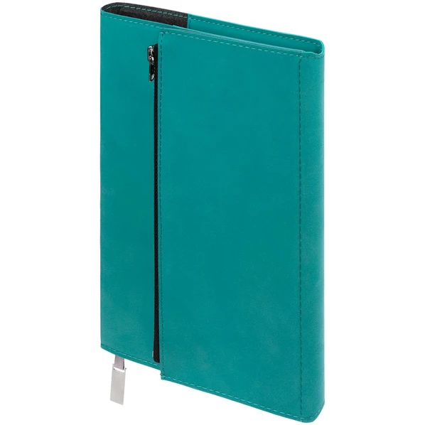 Классический бирюзовый ежедневник Grace в гибкой суперобложке c карманом на молнии, выполнен из материала Nubuck. Дополнен капталом и металлической шильдой на ляссе серого цвета.