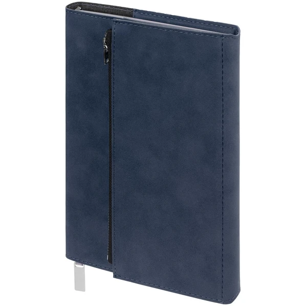 Классический темно-синий ежедневник Grace в гибкой суперобложке c карманом на молнии, выполнен из материала Nubuck. Дополнен капталом и металлической шильдой на ляссе серого цвета.