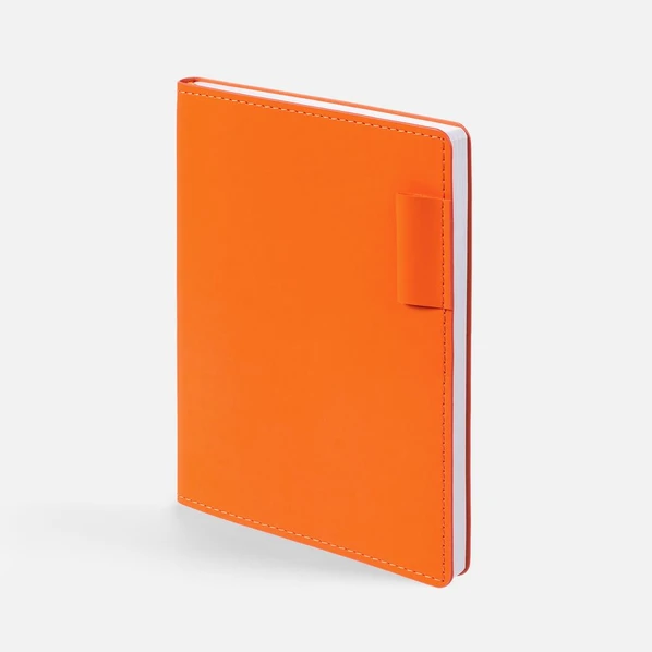 Стильный оранжевый ежедневник с гибкой обложкой из материала Soft Touch. Дополнен петелькой для ручки из покровного материала, капталом, ляссе и закрашенным срезом обложки в цвет материала.