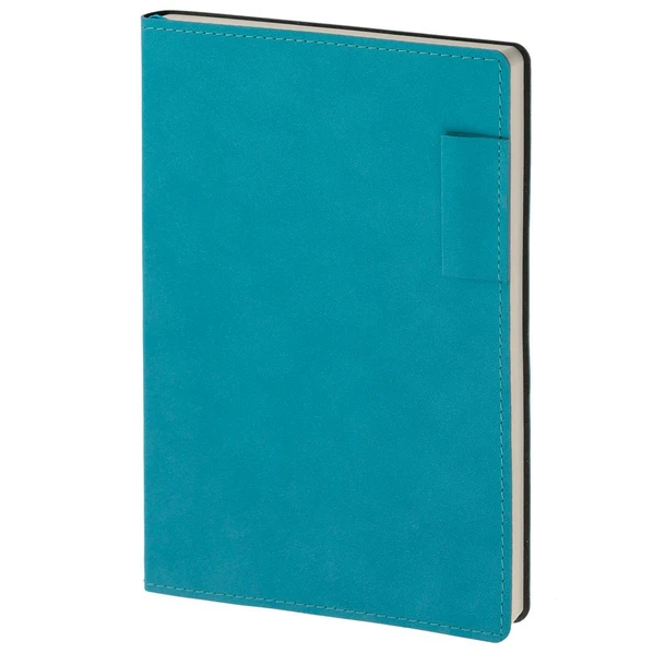 Ежедневник с гибкой обложкой, выполнен из материала Nubuck, цвет морской волны II, дополнен петлей-лейблом для ручки и ляссе в цвет материала.