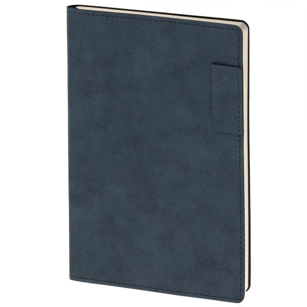 Ежедневник с гибкой обложкой, выполнен из материала Nubuck, темно-синий ХХ, дополнен петлей-лейблом для ручки и ляссе в цвет материала.
