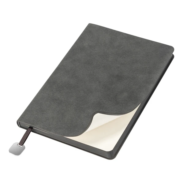 Недатированный темно-серый ежедневник Flexy Nuba. Ежедневник в гибкой обложке. Материал Nuba выполнен из мягкого кожзама, бархатный, матовый, приятный на ощупь, имитирующий замшу. Ляссе одинарное, окрашено в цвет обложки, шелковое, глянцевое. Дополняет ляссе - металлический шильд с гладкой, глянцевой поверхностью.