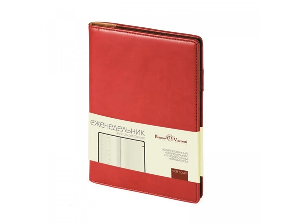 Еженедельник Concept в классической красной обложке формата А5. Практичный, привлекательный и приятный на ощупь, он на протяжении всего срока службы сохраняет презентабельный вид. Уголки обложки имеют закругленную форму, по всему периметру сделана прострочка нитками в тон.