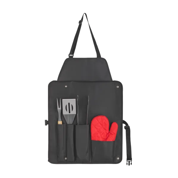 Черный фартук с набором предметов для барбекю. В сложенном виде: 48хd8 см.