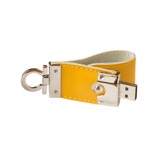Флешка-брелок желтого цвета Промоскин на 32 Гб. Мягкий кожаный корпус не оставит равнодушными ценителей элегантного и строгого стиля, а металлические элементы создадут должное укрепление формы. Вес изделия составляет 21 грамм. Есть возможность нанесения гравировки и УФ печати.